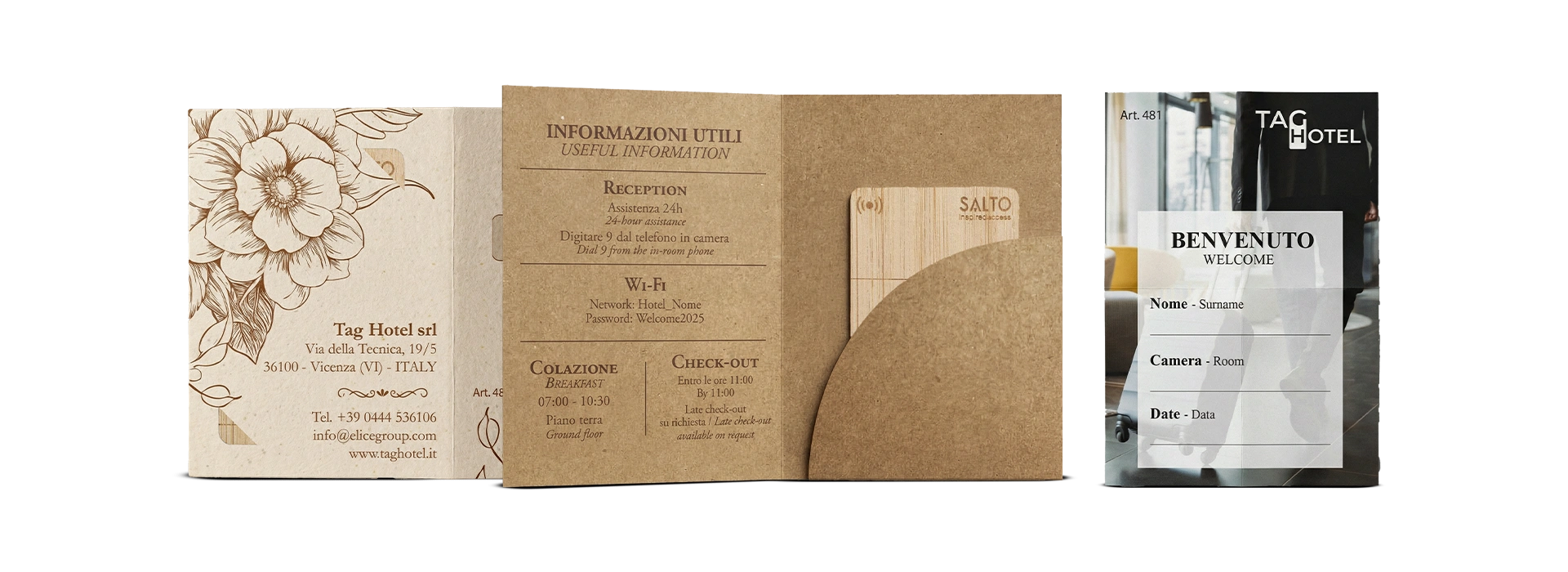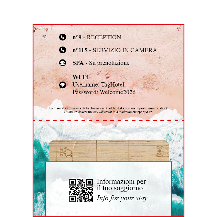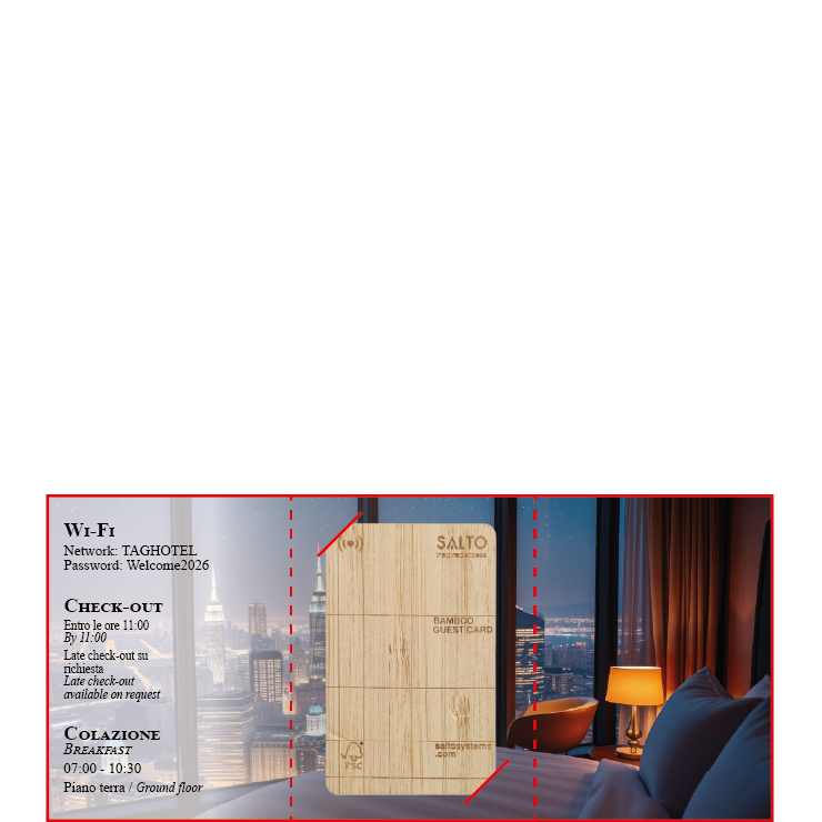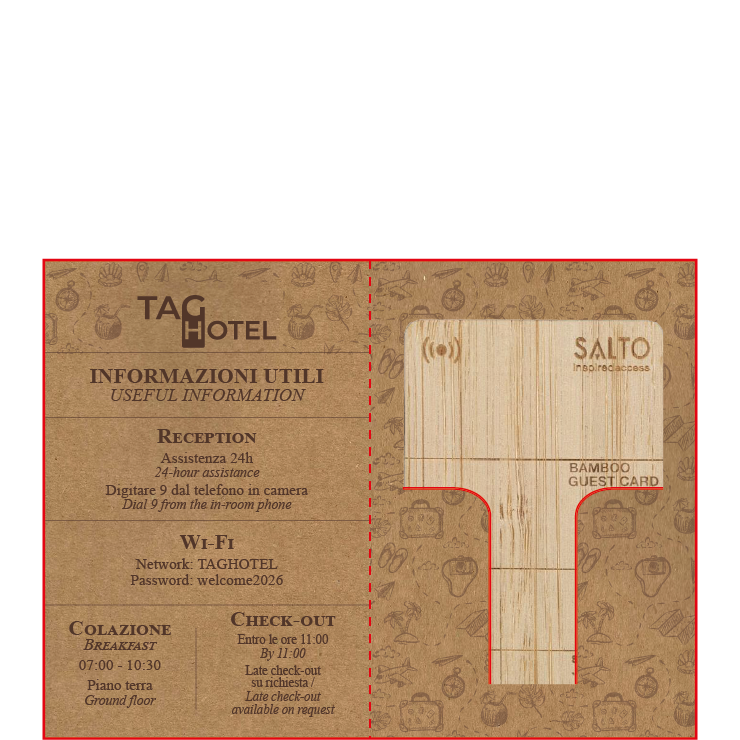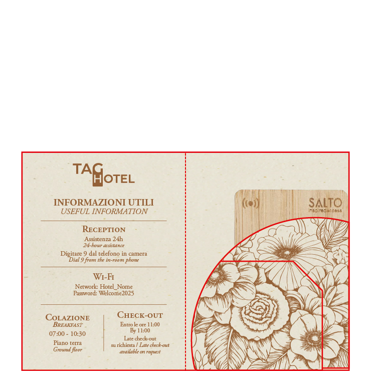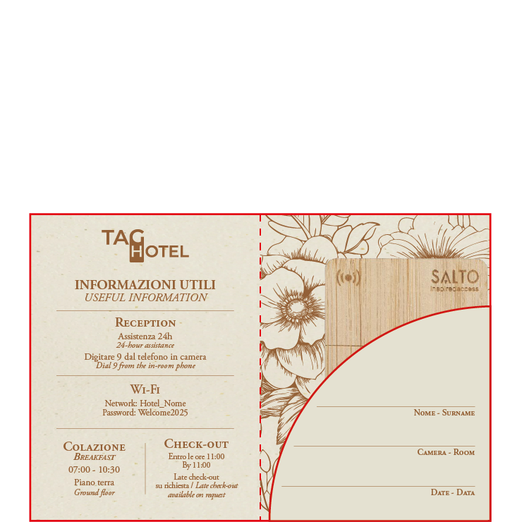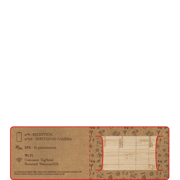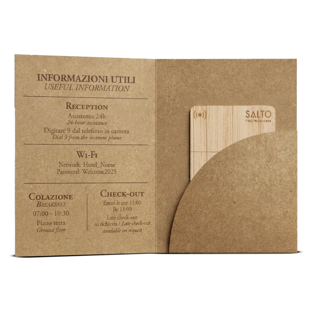 Key Holders personalizzati in carta, pensati per accogliere l’ospite in modo semplice e curato, fin dal check-in. Realizzati con carte di qualità e disponibili in diversi formati, possono contenere la chiave magnetica e le informazioni essenziali come numero di camera, orari della colazione e credenziali Wi-Fi.